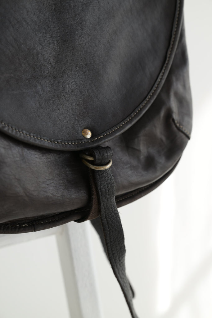 Guidi TF02 in full grain dark chocolate leather. The bag features two side compartments that buckle close and you also can put items in the center. Made of soft horse leather. Piece dyed. 100% leather, unlined interior. Features a top handle or cross body adjustable strap.