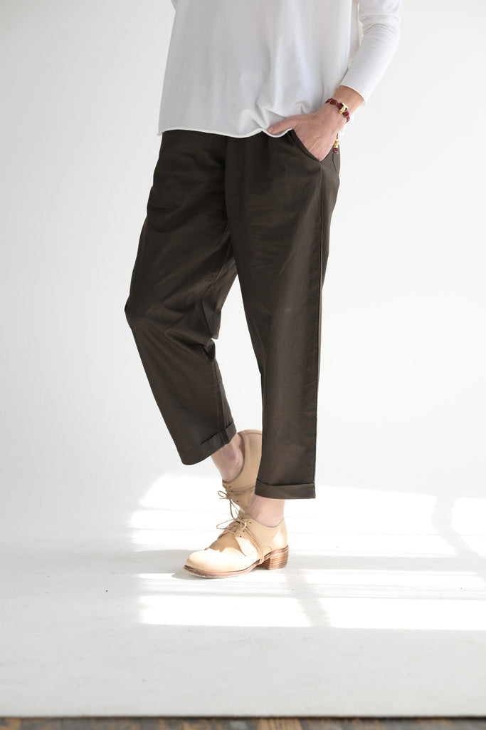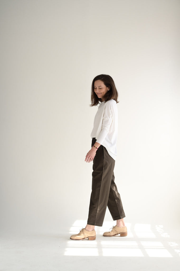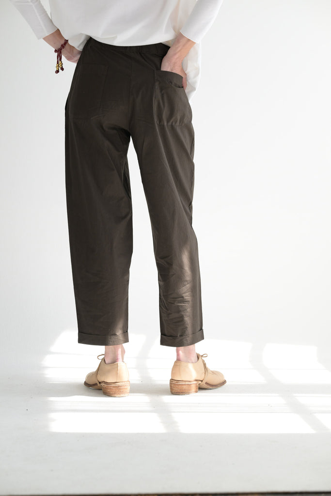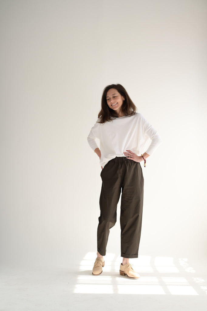 LaboArt Panta Vela is one of their staple styles. Easy pull on pant with elastic waist. Slant pockets. Back patch pockets. Straight legs with fixed cuff. Offered in the Clara cotton poplin fabric.
