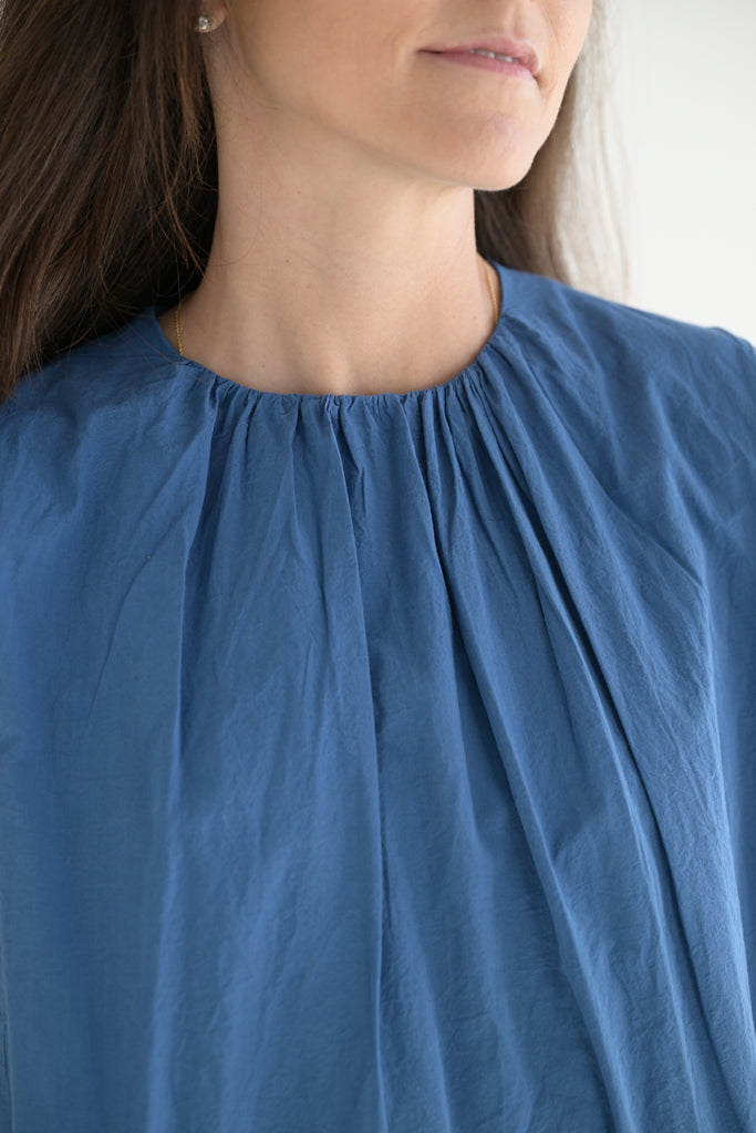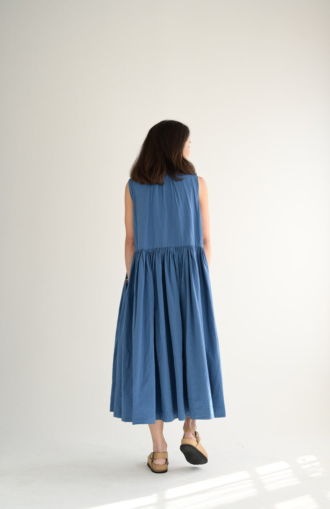 Sleeveless dress in chalk poplin, washed for a soft relaxed hand. Gathered details at neckline and waist, loop and button closure at back neck, side seam pockets.