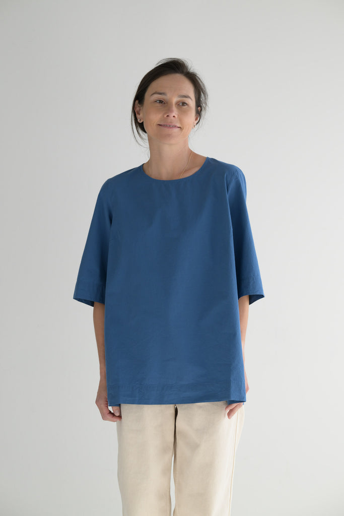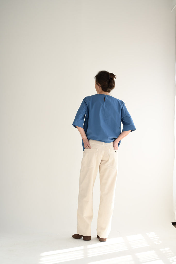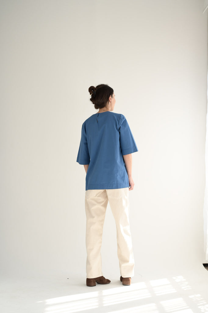Casey Casey short sleeve top cut in chalk poplin, a crisp cotton with a soft washed hand. Designed with a clean round neckline with a loop and button closure at the back. Split hem adds ease and movement.