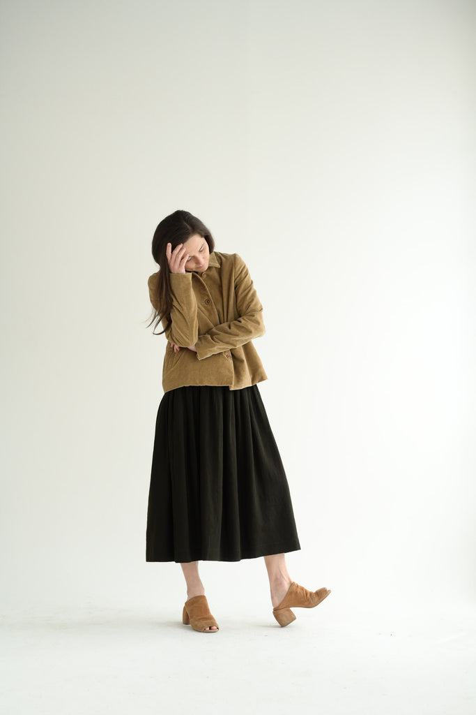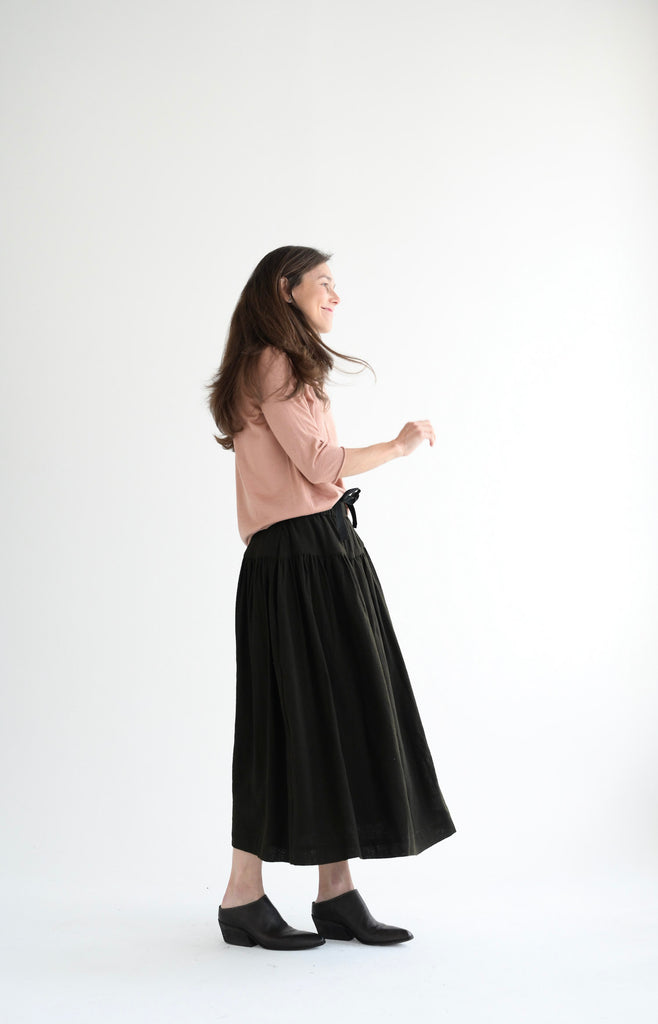 A classic gathered skirt from Casey, this piece is made out of a beautiful wool gauze.  The waist band is elasticated and there is an interior drawstring.  The skirt is fully lined and there are side pockets.