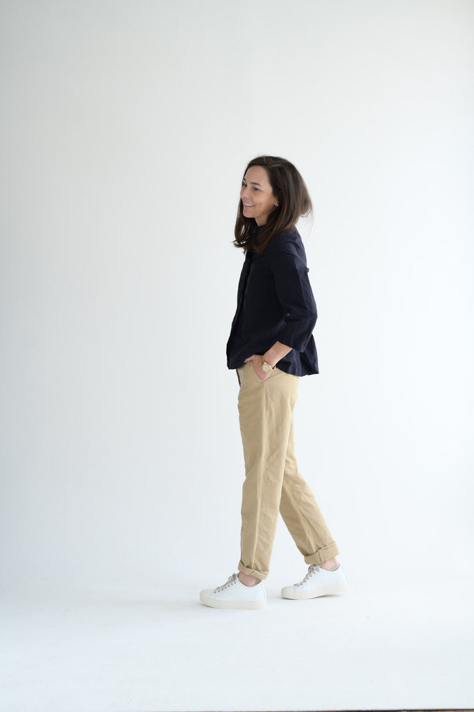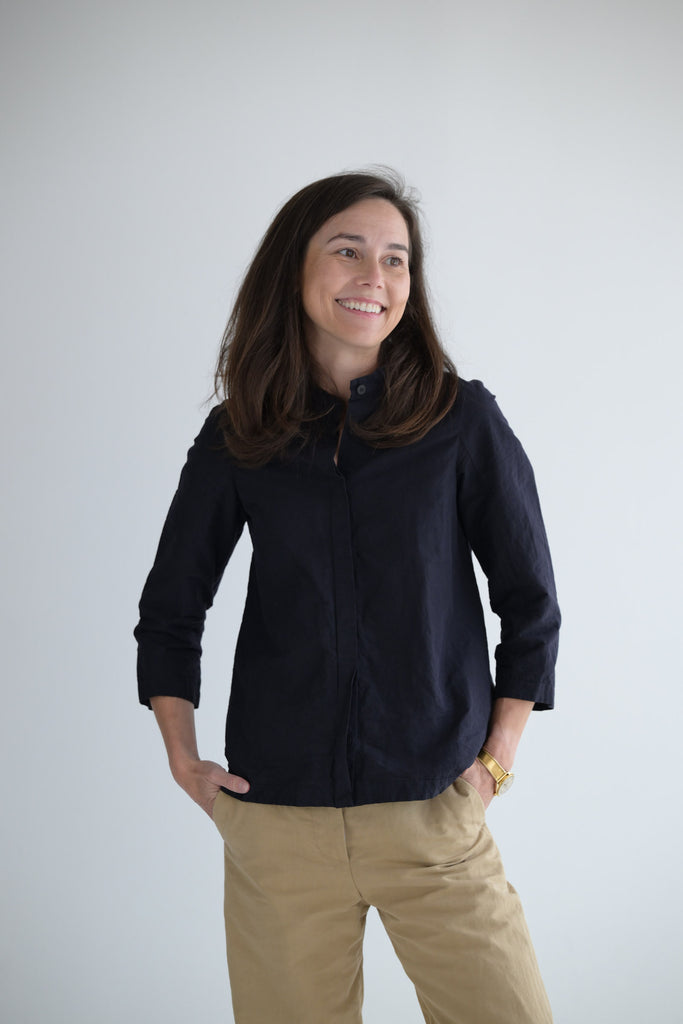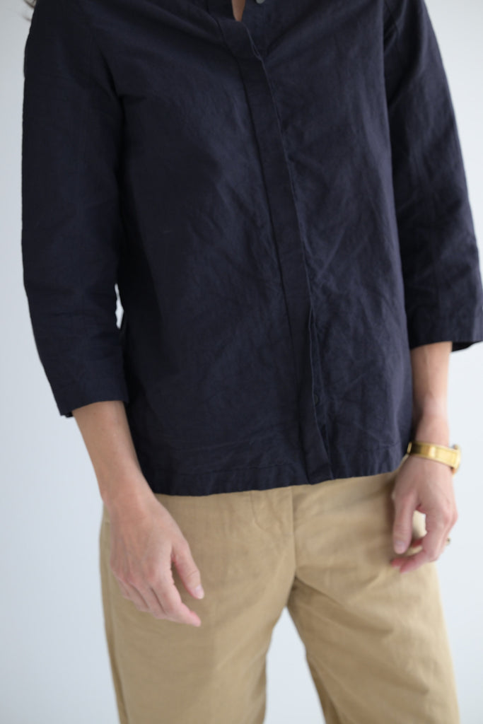 Bergfabel Ada shirt has a band collar and princess seam details at back in cotton linen. Features 3/4 sleeves, set-in shoulders, tailored waist at back with a sculptural pleat, a slightly elongated back hem, and concealed tonal buttons closure at front. Regular fit.