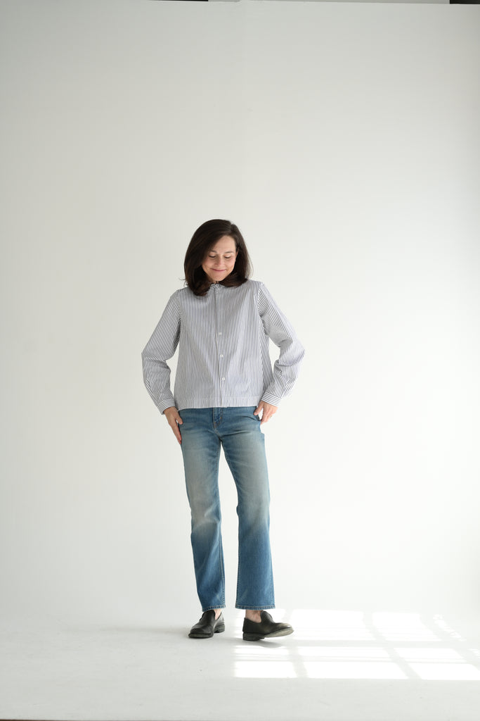 Fabiana Pigna Claude blouse in a beautiful blue stripe. Slightly cropped long sleeve button down blouse featuring a delicate mini ruffle collar. Cut in FP custom dyed high density medium weight cotton.