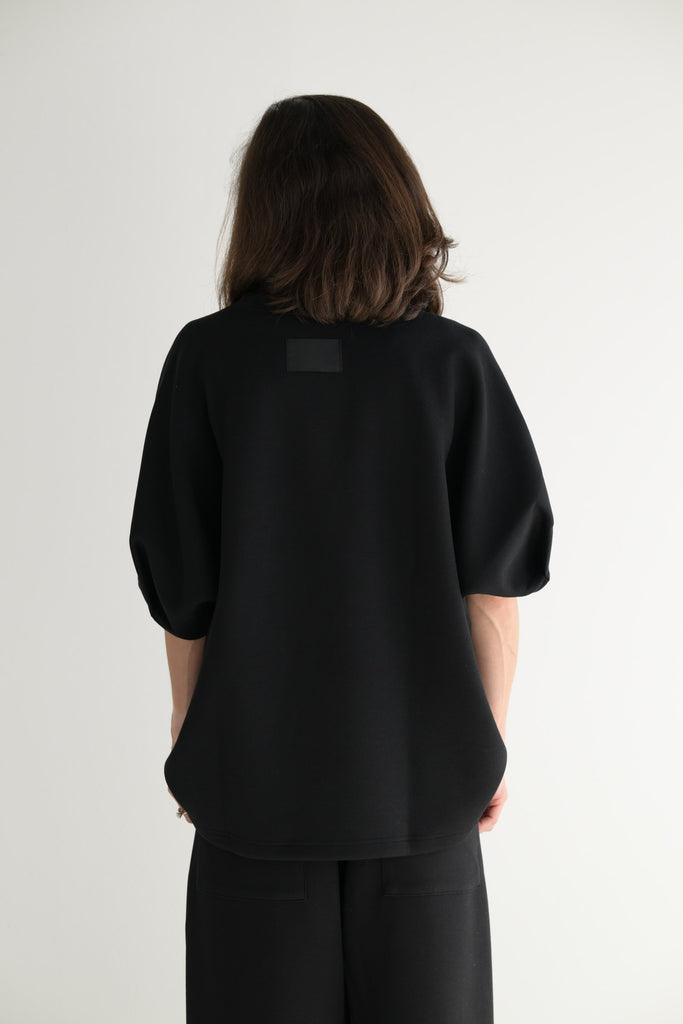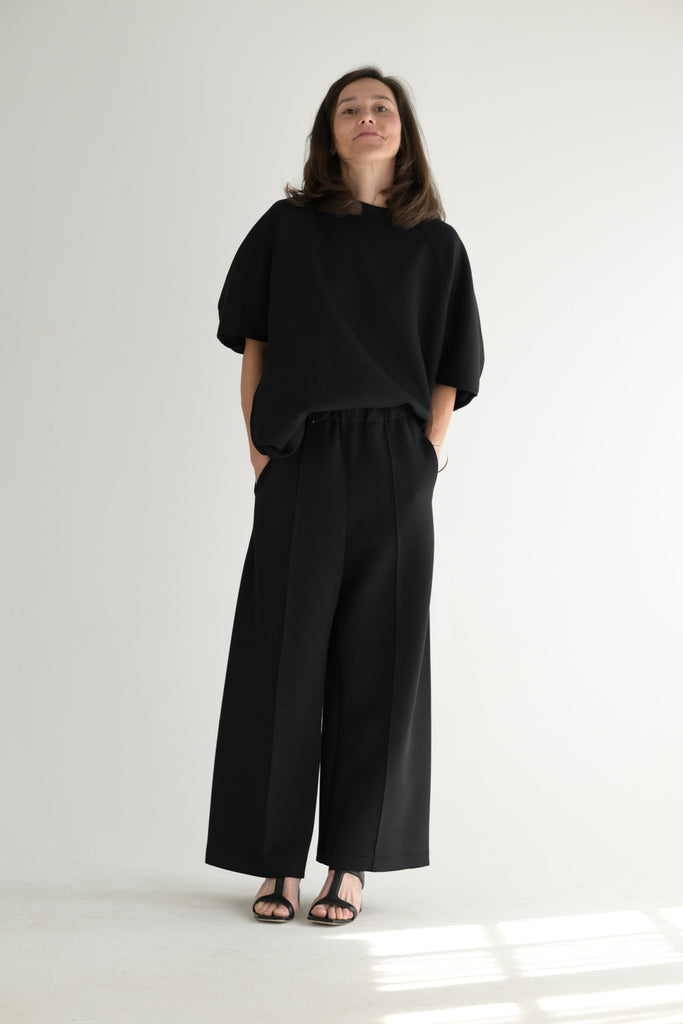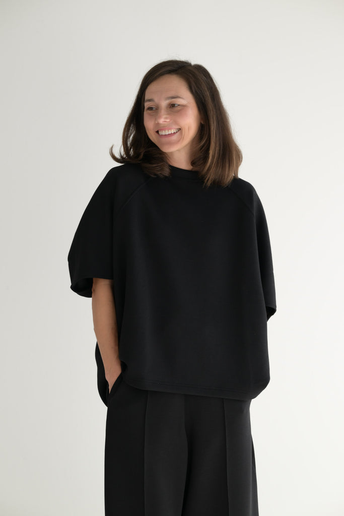 COG the Big Smoke Hellen Pentagon top in airly cocoon twill. Crew neck, elbow length sleeves, high and low hem design. Made of an elegant ball-knit material with a Calzé twill structure.