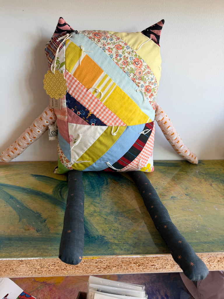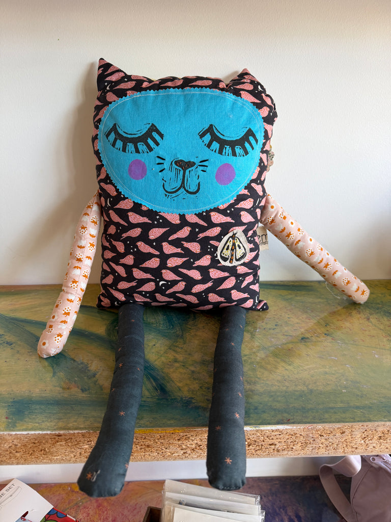 Handmade by local artist, Emlee Handmade. Adorable cat measures 13" x 10" (not including arms/legs). One of a kind.