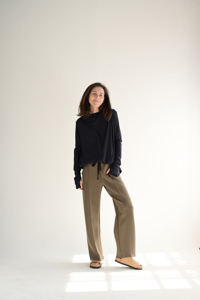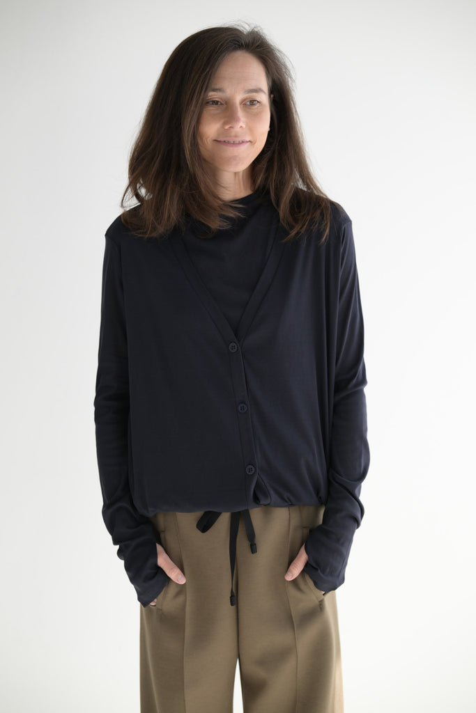 Cog Nadine V-neck cardigan is offered in a super lightweight cotton jersey. Designed with a relaxed fit in the body and sleeves which are elegantly tapered from the elbow down. The square armholes create a distinctive silhouette with compact shoulders, while ensuring a comfortable fit beneath the arms. Thumbholes at the cuffs add functionality and style.