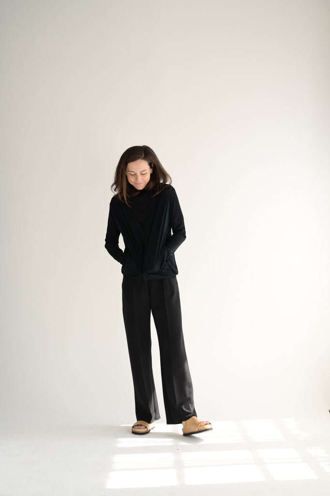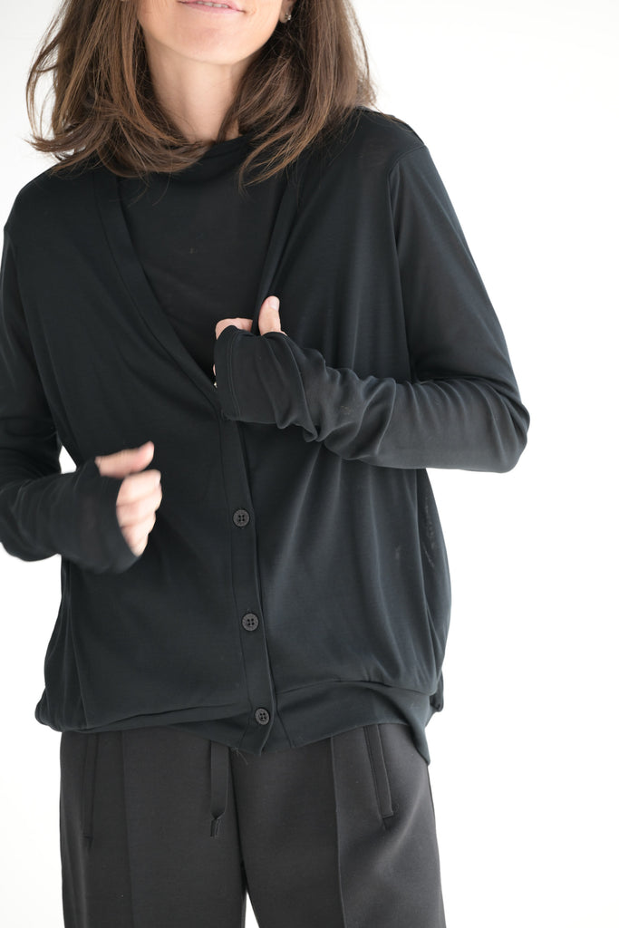 Cog Nadine V-neck cardigan is offered in a super lightweight cotton jersey. Designed with a relaxed fit in the body and sleeves which are elegantly tapered from the elbow down. The square armholes create a distinctive silhouette with compact shoulders, while ensuring a comfortable fit beneath the arms. Thumbholes at the cuffs add functionality and style.
