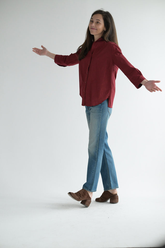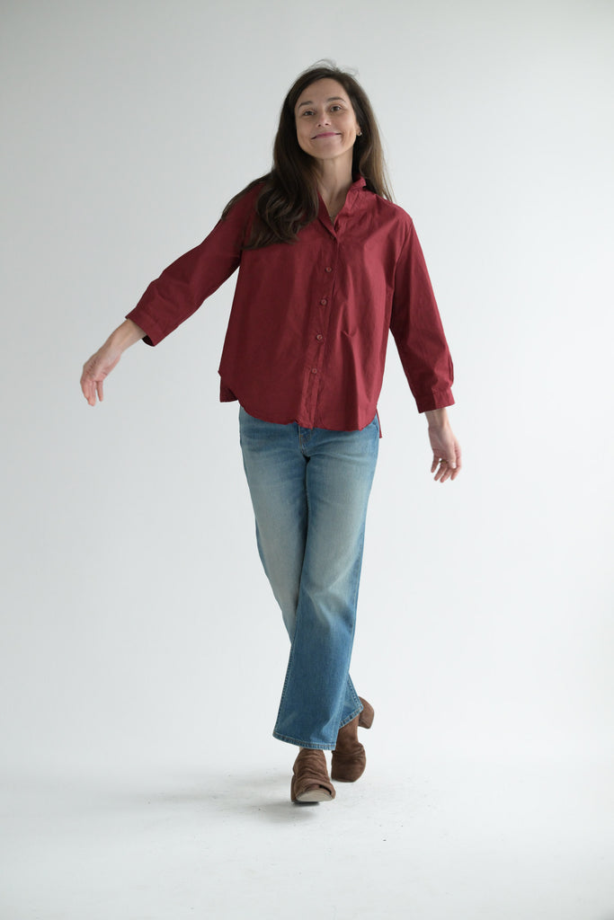 Hannoh shirt Charleen in red cotton poplin. Features 3/4 sleeves, button front, shawl collar, and signature red stitching at the buttons.