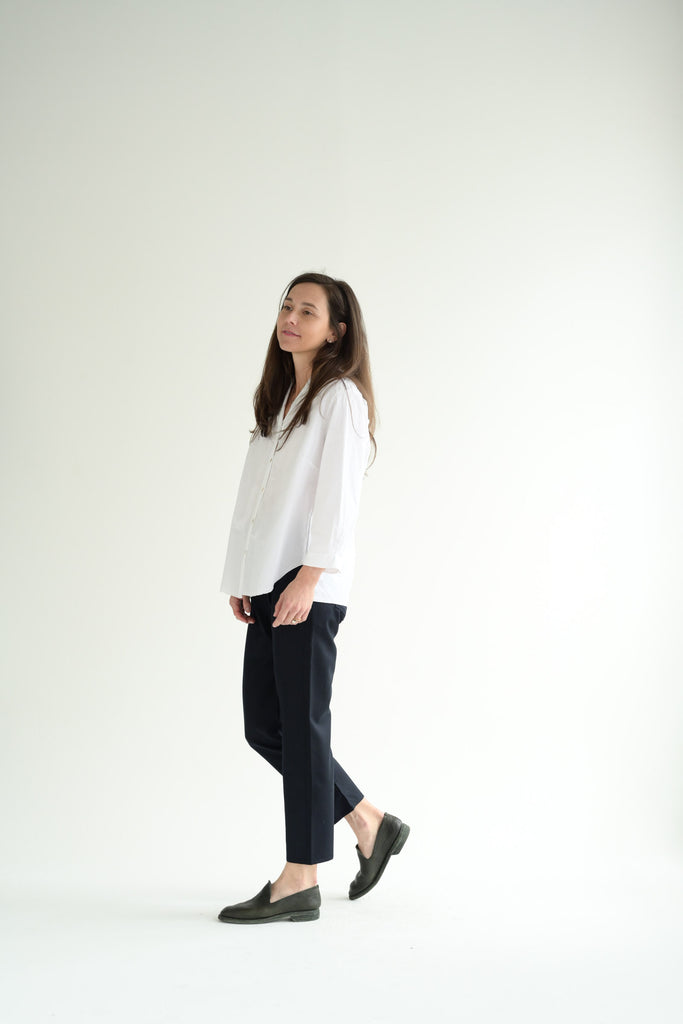 Hannoh shirt Charleen in white cotton poplin. Features 3/4 sleeves, button front, shawl collar, and signature red stitching at the buttons.