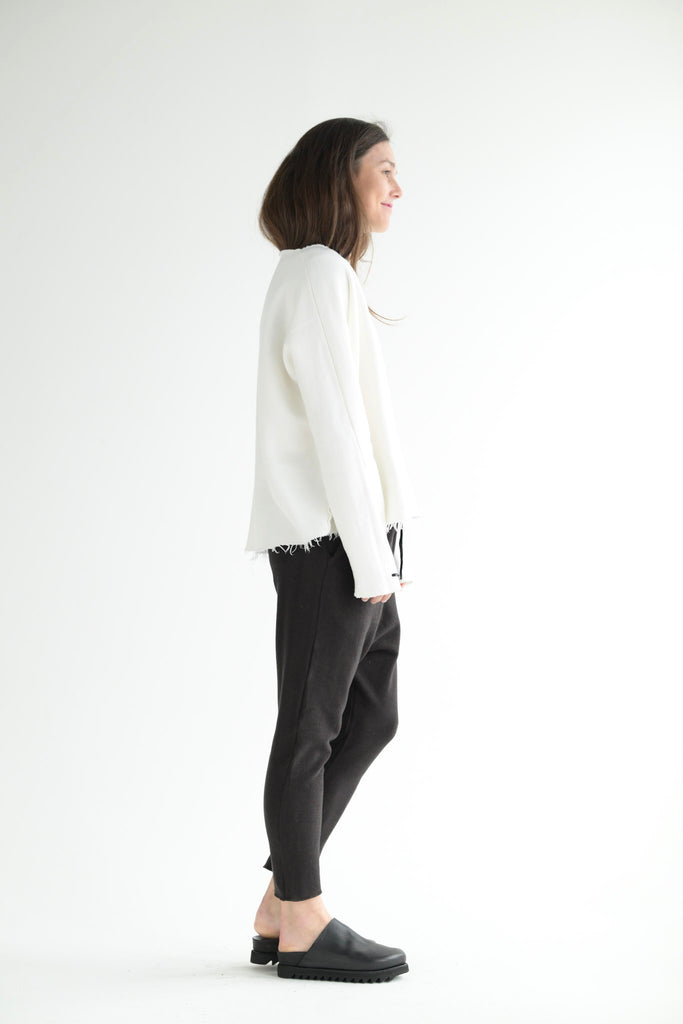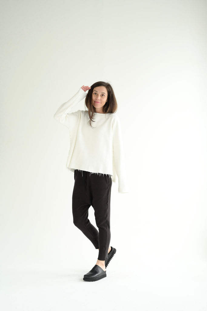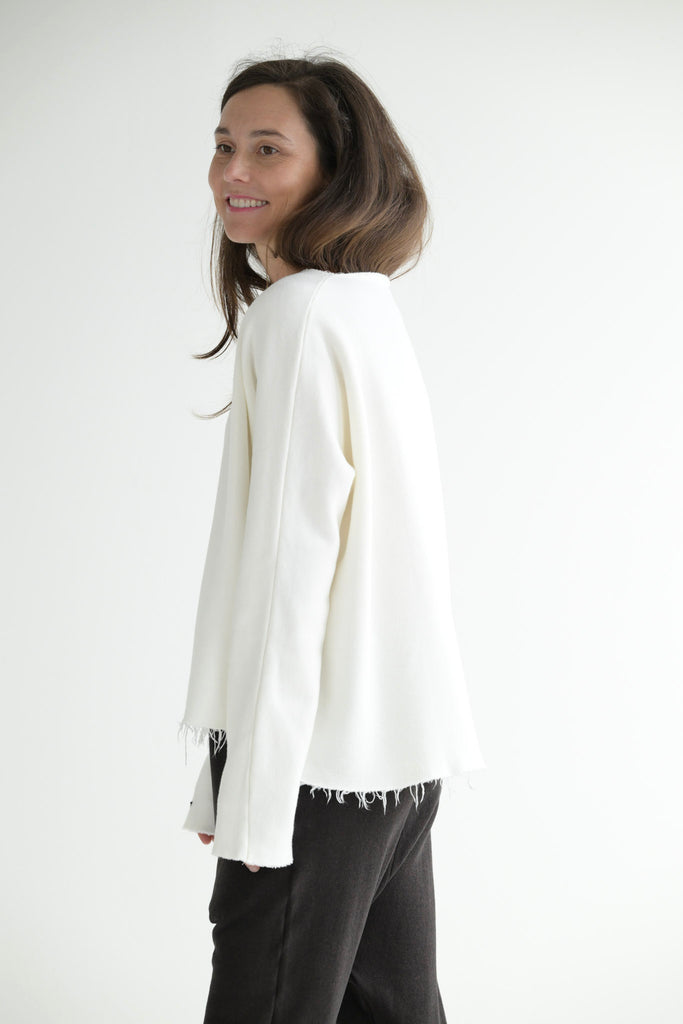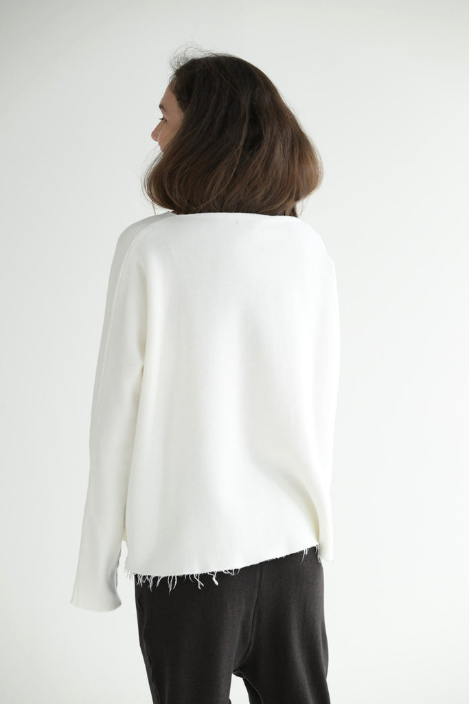 Album di Famiglia milk white sweater with a round neckline and dolman sleeves in soft cotton jersey. Features raw edge finishing at neckline, cuffs, and hem and inside-out seams at sides and sleeves.